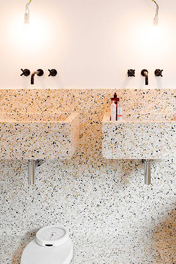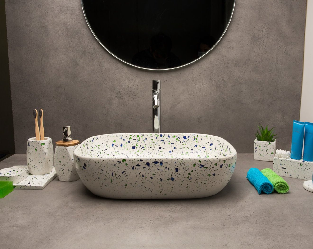 Bagi Anda yang menginginkan tampilan berbeda pada kamar mandi Anda khususnya pada Wastafel, Anda bisa mencoba untuk menggunakan Wastafel dari material Teraso. Teraso sendiri merupakan suatu bahan yang terbuat dari pecahan atau serpihan batu alam seperti marmer dan sejenisnya kemudian diolah kembali dan dicampur bersama resin atau semen putih dan menghasilkan material baru berupa Teraso. Dari segi tampilan, Teraso memang tampak serupa seperti marmer, namun tentu harganya jauh lebih terjangkau.
